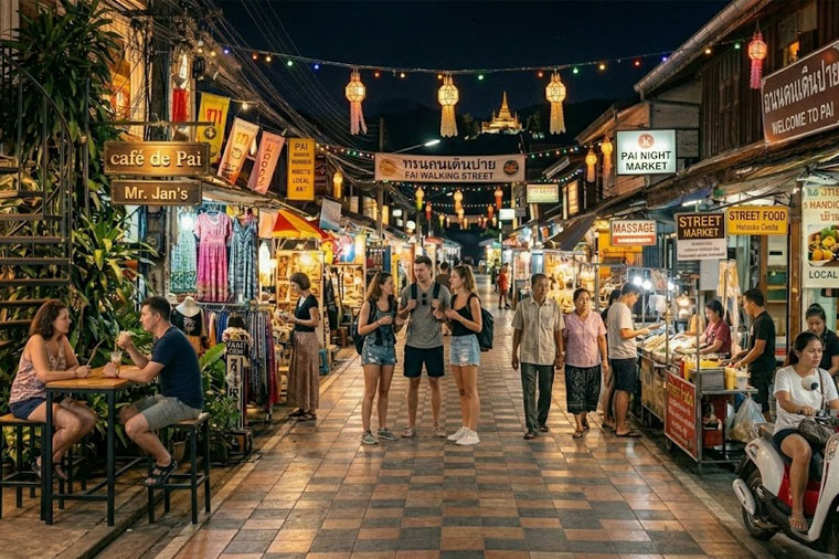 位於小鎮的主要街道,每當夕陽落在群山之間,整條街便搖身一變成為熱鬧的步行市集。小攤沿著街道兩旁綿延數百公尺,從手作飾品、民族風服飾,到當地小吃與果汁攤,散發出濃厚又愜意的山城氣息。無論是尋找紀念品、品嚐地道美食,或單純享受夜色下的浪漫氛圍,拜縣夜市都是探索泰北小鎮魅力的最佳起點。