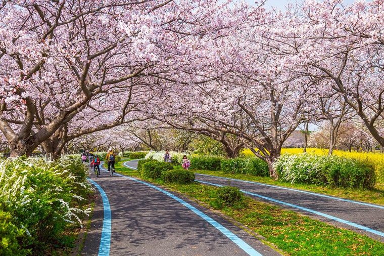【海之中道海濱公園】在櫻花季時,約有1600棵櫻花樹盛開,特別是染井吉野櫻和大島櫻,沿著自行車道形成美麗的櫻花隧道,讓人彷彿走入童話世界。 此外,公園內的花之丘還會同時綻放約150萬株粉蝶花,藍色花海與櫻花相互輝映,形成獨特的視覺饗宴。