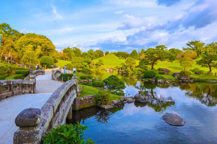 水前寺成趣園是肥後國熊本藩細川家的大名庭園。初代藩主忠利對這片清水潺潺湧出之地頗為喜愛,於1632年在此建造茶屋。之後第三代藩主綱利大建庭園,於1671年建成了一座桃山式的優美迴遊式庭園。取中國詩人陶淵明之《歸去來兮辭》,將其命名為「成趣園」。以阿蘇的伏流水湧出形成的約10,000㎡池塘為忠心,錯落有致地點綴著仿富士山建造的假山、松樹和浮石等,可以欣賞到四時不同的庭園美景。