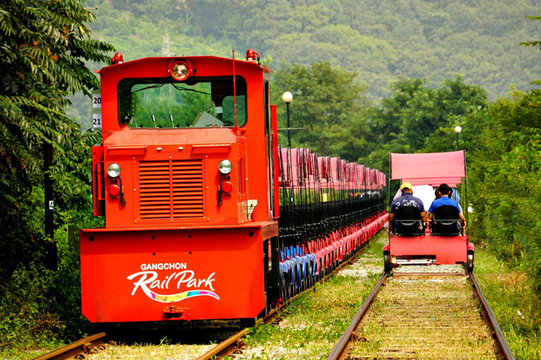 【江村鐵路自行車】因京春線複線電鐵通車而退役的舊京春線鐵路,如今不再有火車通行,取而代之的則是鐵路自行踏車。江村鐵路公園京江鐵路自行車從京春線電鐵京江站旁出發,搭乘處旁設有符合當地特色的巨大書本造型物及五色雨傘造景等拍照區,以及咖啡廳、高空滑索等樂趣十足的設施。