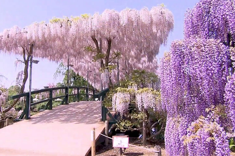 最具代表的花卉,屬於多年生藤蔓植物,莖具纏繞性,直徑達10公分以上,常被用作棚架觀賞植物,花狀花序側生在枝端,20~30朵紫色小花整齊排列,開花時蝶形花朵成串下垂,長度可達15~30公分,花量大時彷彿紫色瀑布,美得令人屏息。公園裡的紫藤約300棵,每逢盛開時聲勢驚人,被公認是全世界最漂亮的紫藤花美景。