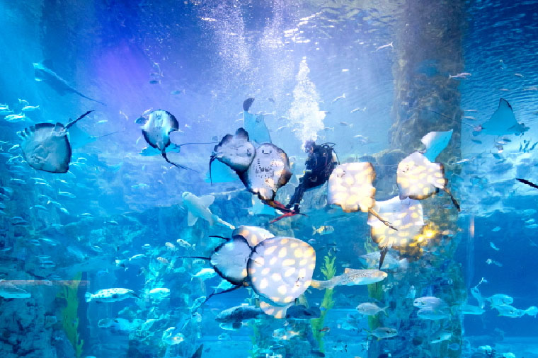 【樂天世界水族館】參觀樂天世界水族館,擁有世界上最大的海洋生態水槽、650 個物種和55000 只生物!體驗5大洋的13 個主題展示、14 個體驗教育項目等。