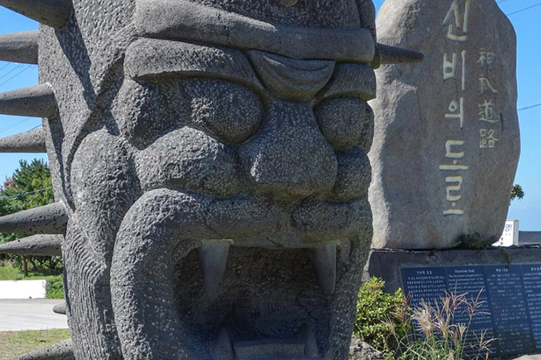 【龍頭岩】彷彿神話傳說中的一條巨龍,傳說中一條巨蛇盼望成龍,竟偷走了漢拏山神的珍珠,遭山神發現而變為石頭。