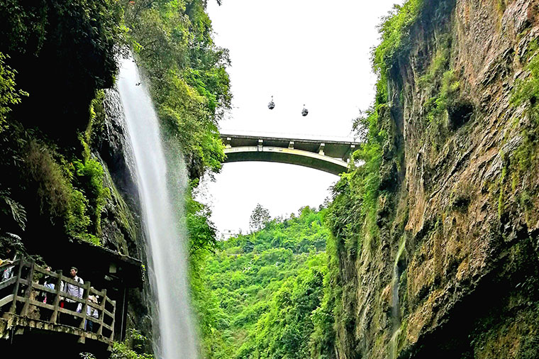 【世界自然遺產~天生三橋】張藝謀影片《滿城盡帶黃金甲》唯一外景地、國家AAAA級景區、世界自然遺產地、世界上最大天生橋群、世界第二大天坑群。地勢的險要在別處是體會不到的,必須要到離它不遠的天坑和地縫。天坑並不在天上,而在地下300米處。坐著電梯扶搖之下近100米,眼前的景色是羊水河峽谷的懸崖萬丈和壁立千仞,感覺實在奇妙。天龍橋即天坑一橋,橋高200米,跨度300米,因其位居第一,頂天立地之勢而得名。一橋橋中有洞,洞中生洞,洞如迷宮,即壯觀又神奇。青龍橋即天坑二橋,是垂直高差最大一座天生橋。橋高350米,寬150米,跨度400米,夕陽西下,霞光萬道,忽明忽暗,似一條真龍直上青天,故名青龍橋。黑龍橋即天坑三橋,橋孔深黑暗,橋洞頂部岩石如一條黑龍藏身於此,令人膽戰心驚。黑龍橋景色以其流態各異的「三迭泉」、 「一線泉」、「珍珠泉」、「霧泉」四眼寶泉而獨具特色。