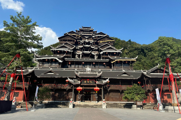 【蚩尤九黎城】位於重慶彭水縣,烏江左岸,佔地30公頃,總建築面積59680平方公尺,地處新老城區連接帶,是彭水自然風光與苗族歷史文化的有機結合體,堪稱大陸第一苗王城。採用兩軸、兩區、九星佈局,主要建築包括四城門、椎牛場、百苗文化長廊、九黎部落、北斗七星亭、魁星樓、神問台、蚩尤苗、九黎宮、苗王府、點將台、將軍柱等,集千餘工匠畢生智慧於一城。合鼓宴,儺舞絕技獨具一格。蚩尤九黎城是大陸最大的苗族傳統建築群,創下了數個世界之最:九黎神柱是目前世界上高度最高、直徑最大、雕刻鬼神像最多的苗族圖騰柱;九黎宮是世界最高最大的吊腳樓建築體,世界最大的四合院建築體,最奇特的樓中樓閣與樓中殿堂建築集群;九道門是目前世界上建有最多朝門的苗族建築景觀。