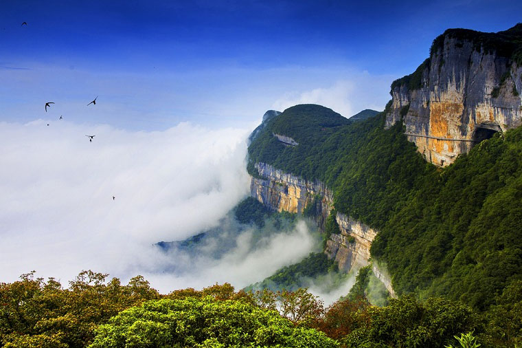 世界自然遺產,位於重慶南部南川市境內,屬大婁山山脈,由金佛、箐壩、柏枝三山組成。金佛山與珠穆朗瑪、瑪雅文明,古埃及金字塔同處於神秘北緯30度附近,金佛山主峰風吹嶺海拔2251公尺,每年積雪期長達4個月之久,也是大婁山脈最高峰。在夏秋晚晴的時候,落日斜暉把層層山崖映染得金壁輝煌,如一尊尊金身大佛閃射出萬道霞光,異常壯觀而美麗,「金佛山」也因此而得名。以其生物多樣性特點和獨特的喀斯特地貌特徵被列入世界自然遺產名單。