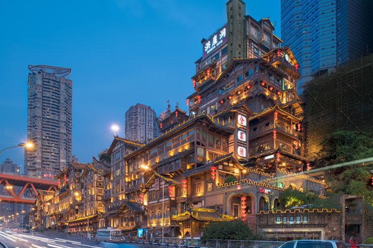 位於重慶市核心商圈,長江、嘉陵江兩江交匯的濱江地帶,坐擁城市旅遊景觀、商務休閑景觀和城市人文景觀於一體。以最具巴渝傳統建築特色的"吊腳樓"風貌為主體,依山就勢,沿江而建。巴山渝水的絢麗風光,齊集了重慶所有吃、喝、玩、樂元素,重慶古、今印象在這裡有了交集。