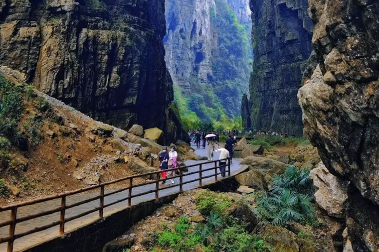 武陵山大裂谷,位於重慶市涪陵區城東南約40千米的武陵鄉境內,武陵山系西北尾端,烏江下游東岸。為劇烈的地谷運動造就的絕壁裂縫景觀。大裂谷所屬山脈為古老的武陵山,是苗嶺分支,海拔在600~1980米。武陵山大裂谷景區占地面積29.96平方千米,由眾多峭壁、奇峰和地縫構成,是中國南方喀斯特地貌的典型代表。核心部分為一條長10千米的喀斯特地貌原生態峽谷,集山、林、泉、洞、瀑、湖、潭、峽、坑、縫於一體,旅遊資源豐富。十裡大峽穀雄闊壯美,谷底奇石疊壘,溪流淙淙,天然絕壁綿延數裡,著名的景觀有銅牆鐵壁、如來神掌、將軍石等。