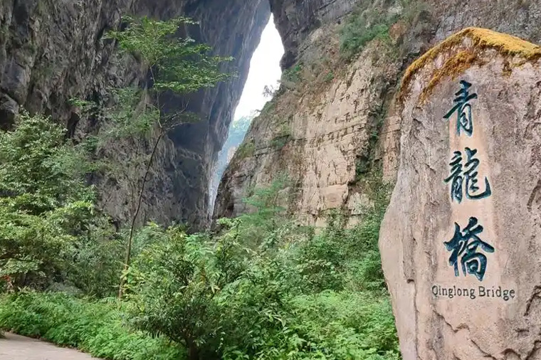 即天坑二橋,是垂直高差最大一座天生橋。橋高350米,寬150米,跨度400米,夕陽西下,霞光萬道,忽明忽暗,似一條真龍直上青天,故名青龍橋。