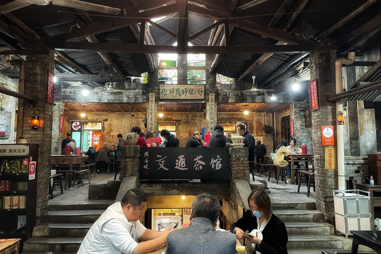 位於黃桷坪正街,是重慶唯一保持著上世紀七八十年代風格的茶館。 茶館瀕臨破產時,常去茶園采風的川美教授、畫家陳安健出於保護茶園原生態的初心,在與運輸公司商量達成共識後開始資助並承包了茶園,隨即更名為“交通茶館”,最大程度地保留了原風格,留住了老茶客,使得“交通茶館”獨特的市井生態和藝術氛圍得以延續至今。