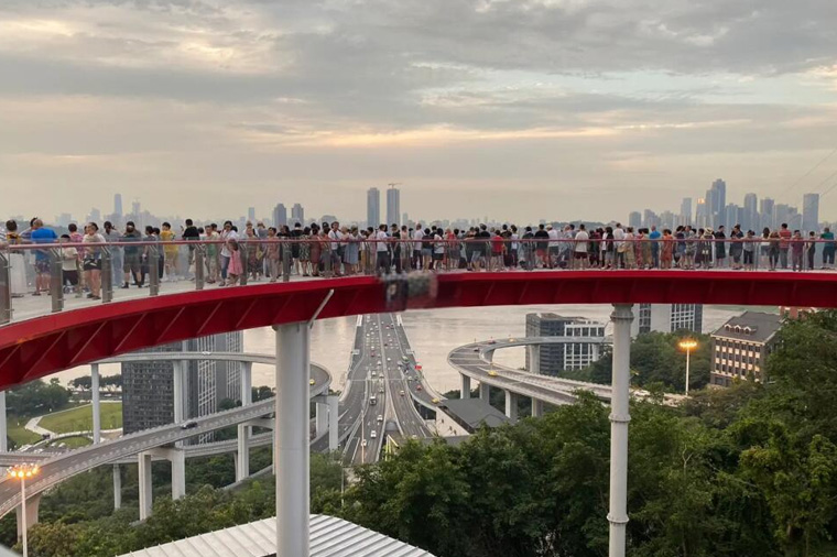 位於南岸區蘇家壩立交南側上方,菜園壩長江大橋的南橋頭。觀景台由大小兩個圓環組成,與地面落差有 50 米高,造型大氣。紅與銀的色彩,與重慶的城市氣質格外匹配。這一環形觀景台又被譽為“城市最美陽臺”,從某些角度看過去,仿佛懸浮於城市上空。站在平臺上,既能看到腳下的重慶“過山車”蘇家壩立交,又能看到遠處的菜園壩長江大橋以及渝中半島的風光。在這裡可以俯瞰 270 度無敵江景,魔幻山城最具標誌性的風光,在這裡輕鬆盡收眼度。