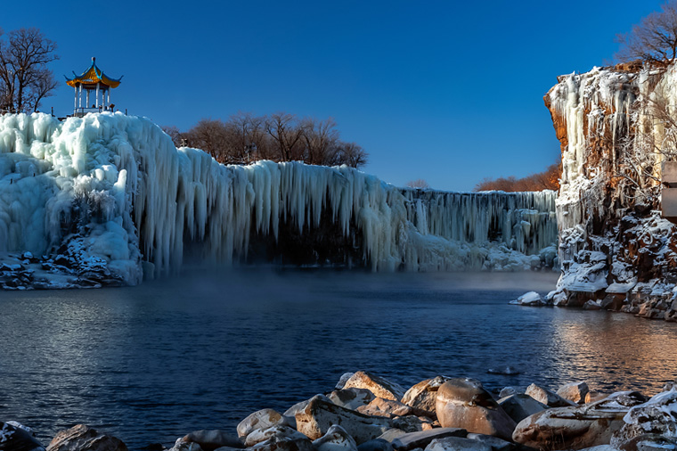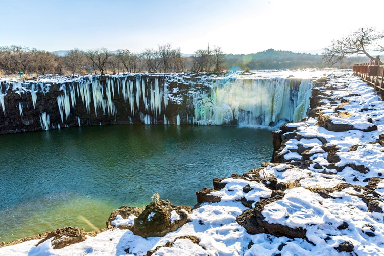 【吊水樓瀑布】這是鏡泊湖水瀉入牡丹江的出口,只有身臨此處,才知道當地稱為吊水樓,真是恰如其分。此處有一道大壩,水從壩上往下沖,形成一個落差約20公尺,寬約40公尺的瀑布。瀑布下的石塊受到沖擊,年深日久,淘挖磨蝕成圓柱形的深潭,深達數十米,周圍還有涼亭和鐵鏈圍欄,供遊人站在瀑布上面岸邊觀瀑。