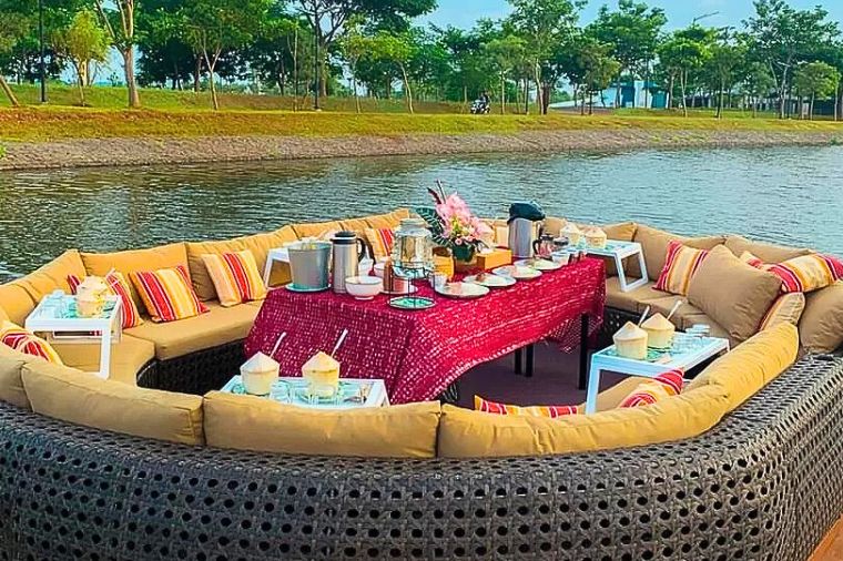 這是一項新興熱門體驗,沿著 Tahang 河打造的 60 公頃綠化,河道兩岸種滿了熱帶綠色植物,環境寧靜優美,與繁忙的雅加達市區形成鮮明對比,還能讓遊客在 Tahang 河上欣賞美麗的日落,在這之外,特別的是雙體船改造成一個優雅的用餐空間(浮動餐廳),讓各位在這一條Tahang 河上搭著船一邊觀賞火紅的夕陽映照在河面上,一邊享用道地的印式風味料理,氣氛浪漫萬分。