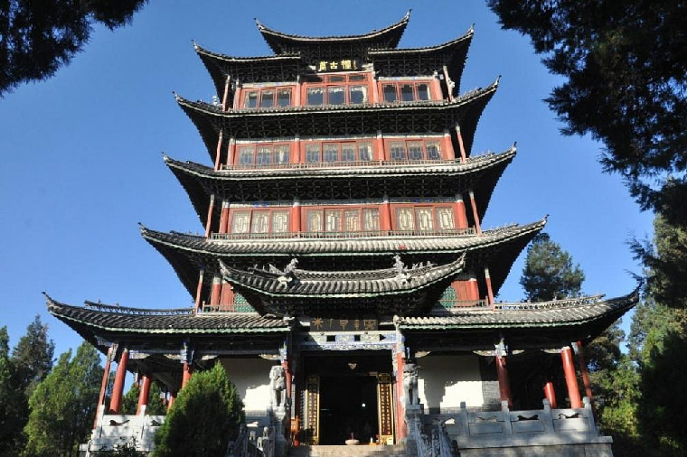 【萬古樓】位于麗江縣城獅子山頂,樓共五層,斗拱重簷,用16根22米高的木柱貫通各層,總高度30多米,是中國木結構建築第一樓。登上萬古樓,可以將整個麗江壩盡收眼底,腳踏獅子山漫漫林海,北望玉龍十三峰,東俯麗江古城以及氣勢輝煌的仿故宮建築群──木府,風景實為壯觀。