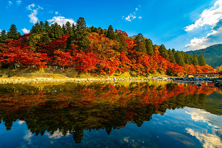 【香嵐溪】雄偉壯觀的香嵐溪是日本秋季首屈一指的賞楓勝地之一,四周為懸崖峭壁所圍繞,一到秋天便化身為展示秋日繽紛色彩的壯麗萬花筒。11個品種、4,000多棵楓樹展現出日本國內最宏偉華美的色彩演出。巴橋是可以欣賞整個香嵐溪谷日夜風光的最佳觀景點之一,就位於香嵐溪巴士站及豐田市政府足助分所旁。您可從巴橋穿過一條由高大楓樹形成的美麗隧道進入香嵐溪深處以及另一處名勝,也就是本地區的代表性景點「待月橋」以及一旁可以於同棵楓樹上欣賞到五種不同顏色楓葉的獨特五色楓美景。