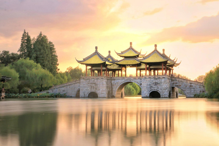【瘦西湖】瘦西湖的美主要在于蜿蜒曲折。十里瘦西湖,有二十四橋、五亭橋、白塔、大虹橋、小金山、徐園、吹台、月觀等名勝。瘦西湖以“瘦”為特征,湖面時寬時窄,兩岸林木扶疏,園林建筑古朴多姿,行船其間,景色不斷變化,引人入勝。