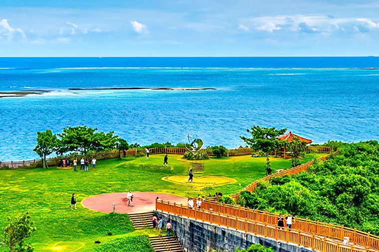 知念岬公園位在沖繩的東南角,從公園一端可一望太平洋的美景。而且由於不受視野遮蔽,也是當地著名的日出之地,每年元旦都會聚集不少遊客至此欣賞新年的日出。視野良好的日子,還能看到漂浮於遠處的與勝半島(又稱勝連半島),以及被稱為「神之島」的久高島,傳說中當初神祇創造琉球國土時,便是降臨於此。