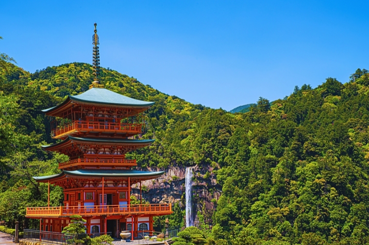 【熊野那智大社&那智瀑布】擁有超過千年的歷史。神社坐落於那智山半山腰,背倚茂密森林,面向壯麗的太平洋,環境清幽而神聖。它以自然崇拜為起源,最具代表性的象徵便是高達133公尺的那智瀑布——日本最高的瀑布之一,自古以來被視為神聖之水源。