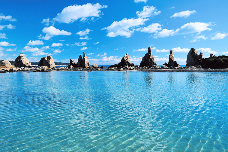 【橋杭岩】弘法大師空海求菩薩相助造橋所在地,約有40多個大小不等巨石連立海中,宛如橋墩狀豎立在驚濤駭浪中。