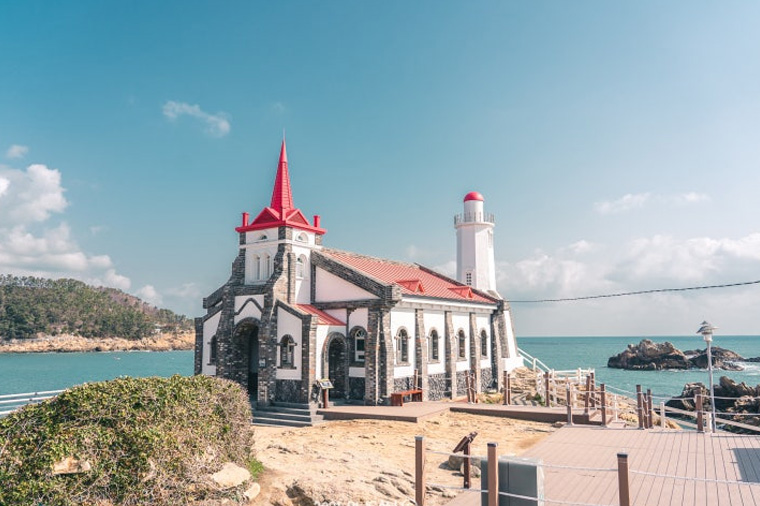【竹城聖堂】是位於小漁村的地理特性,使其形成了與眾不同的氛圍,彷彿將中世紀某座海濱村莊原封不動搬來,整座聖堂與周邊風景如畫一般美麗。打在岩石上的白色碎浪與聖堂的紅色屋頂形成鮮明對比,一下子便吸引了訪客們的目光。竹城聖堂中最多人排隊等候之處,便是如同架好相框般的拍照區,相框中的藍色大海和天空形成了絕美的背景。