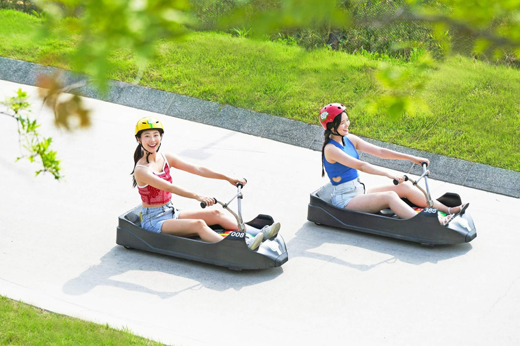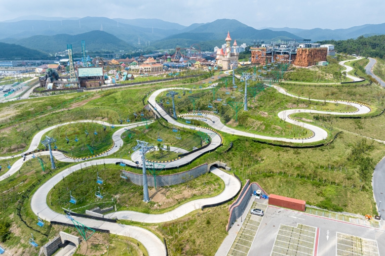 【SKY LUGE渠道滑車】2021年新開幕釜山特色體驗遊樂設施,Skyline Luge利用下坡重力加速度,讓體驗者宛如賽車手般奔馳,且搭乘纜車上山的過程可一覽釜山樂天樂園與海景,園區一共有四條路線,相加起來總長約2.4公里,園區會依照當日的旅客量來決定開放兩條或四條賽道。斜坡滑車操作簡單,都會有專員先教學如何控制滑行、停止及方向操作,園區裡還有販賣部、紀念商品等。