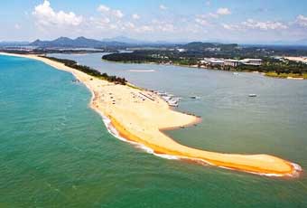 【玉帶灘】是瓊海市博鰲鎮的一處沙灘半島,遊客只能坐遊船前往。站在狹長的玉帶灘上,一側是南海,一側是河流交匯處,景色非常奇特。由於南海的浪較大,下水游泳比較危險,遊客一般選擇只在沙灘上玩耍,欣賞河與海交匯處的獨特景觀。