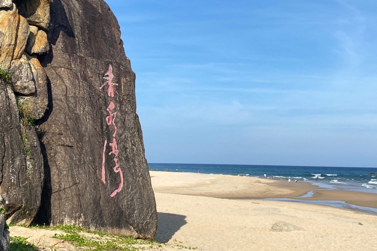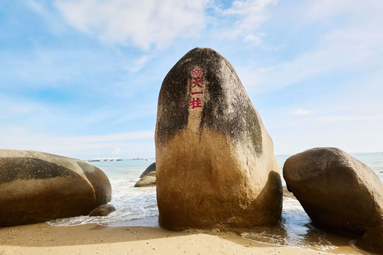 【天涯海角】石指的是日月石往西數公里的一組岩石中的兩塊。 整個天涯海角風景區內怪石嶙峋,且其上有許多文人墨客的遺蹟,多是歷代被流放到此的官員觸景生情所作。整個風景區海灘綿延數公里,沙灘上多有衝上來的貝殼類生物。此處是中國大片陸地的最南端,由此向南便是一望無垠的南海。