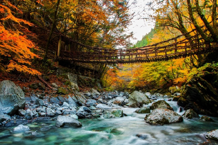 【祖谷溪吊橋】蔓藤橋是從秘境奧祖谷中長出來藤蔓編織而成的橋,為日本三大奇橋之一。據說是800年前,由當地最大勢力的平家為訓練馬匹所架設。