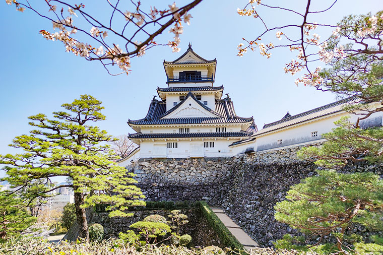 【松山城】松山城位於松山市中心地帶、海拔132公尺的勝山上。山頂上建有本丸,山麓原野則有成為史蹟庭園的二之丸,以及作為堀之內公園備受喜愛的三之丸。在關原之戰活躍的加藤嘉明為初代藩主,他自慶長7年(1602年)起花費長達四分之一世紀建城,使其成為「現存十二天守」之一,城內擁有21棟重要文化財。