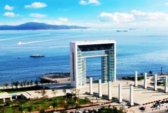 【幸福門海濱公園】,幸福門正對世昌大道,整棟建築呈“門”字型,著重體現威海城市發展的歷史軌跡和開放、發展的城市形象。這座建築之所以稱做幸福門,是因為幸福門正好是威海千公里幸福海岸線的起點,在整個所在地北邊的起點上,亦在城市的中心。