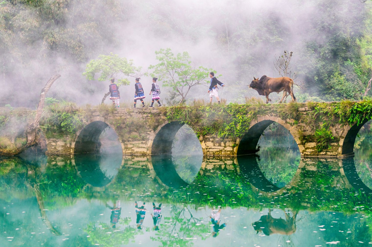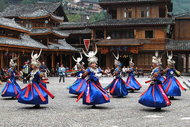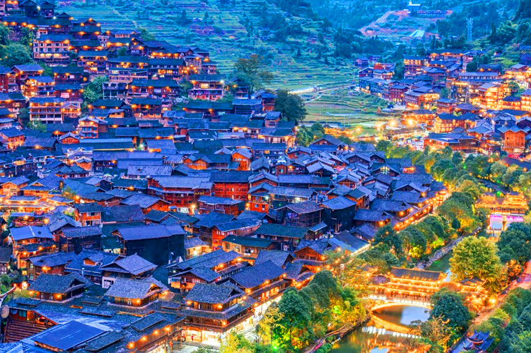 【西江千戶苗寨】位於貴州省黔東南苗族侗族自治州雷山縣西江鎮,坐落在雷公山麓、白水河畔,由羊排、東引、南貴等10餘個依山而建的自然村寨連片構成,是中國現存最大的苗族聚居村寨,其歷史可追溯至2000多年前苗族第五次大遷徙時期。據2005年統計,西江千戶苗寨共有居民1288戶、6000人,其中苗族人口占99.5%。西江千戶苗寨保存有典型的苗族建築、服飾、銀飾、語言、飲食、傳統習俗。寨內建築以木質吊腳樓為主,分為平地吊腳樓與斜坡吊腳樓兩類,採用穿斗式歇山頂結構;一般分為三層,底層儲放農具、飼養牲畜,二層為生活起居區域,三層用於存放糧食;「苗寨吊腳樓營造技藝」於2006年列入國家級非物質文化遺產名錄。2011年被評為國家4A級景區。