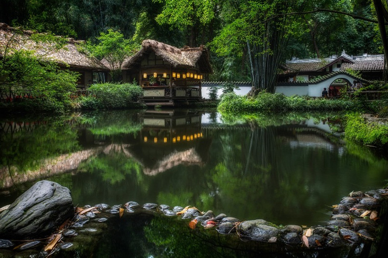 【杜甫草堂】中國著名詩人杜甫在成都的故居,『文物景點遊覽區』即杜甫草堂遺址,中軸線上排列著正門、大廨、詩史堂、柴門、工部祠,「詩史堂」是杜甫草堂的中心建築,中央的杜甫像由劉開渠雕刻,堂內展出歷代名人所題的楹聯和匾額;「工部祠」供奉杜甫畫像,旁祀陸游和黃庭堅,祠東側為「少陵草堂」、後方則是「茅屋景區」,依照杜詩情境和明代格局的特點所建的景觀。