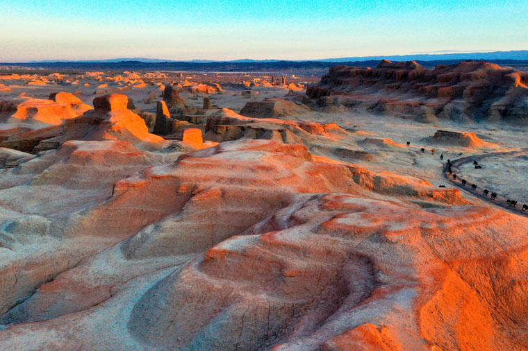 【五彩灘】五彩灘是懸崖式的雅丹地貌,山勢起伏、顏色多變,其是由激猛的流河侵蝕切割以及狂風侵蝕作用而共同形成。由於河岸岩層間抗風化能力的強弱程度不一而形成了參差不齊的輪廓,這裡的岩石顏色多變,且在落日時分的陽光照射下,岩石的色彩以紅色為主,間以綠、黃、白、黑及過渡色彩,色彩斑斕、嬌豔嫵媚,因此被稱作“五彩灘”並號稱是“新疆最美的雅丹地貌”。