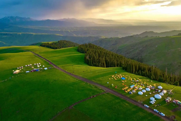 【喀拉峻大草原】位於新疆伊犁河谷的特克斯縣境內,地處西天山向伊犁河谷的過渡地帶。草原海拔範圍廣,約1305米至3957米,東西長約89公里,南北寬約32公里,總面積達2848平方公里。這裡氣候涼爽濕潤,降水豐富,土壤肥沃,適宜多種優質牧草生長,生長著上百種禾本科、豆科和菊科植物,形成典型的高山五花草甸天然大草原。草原夏季水草豐茂,氣候涼爽且蚊蠅稀少,非常有利牲畜生長。每年約有30多萬頭牲畜在此度夏,草原牧草覆蓋率高達90%至100%,草層高度達65至100厘米,是聯合國糧農組織評定的世界第一流天然草場。「喀拉峻」在哈薩克語中意為「黑色肥沃遼闊的莽原」,歷史上傳說烏孫王曾將此作為夏牧場,賦予草原神秘而尊貴的色彩。