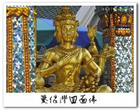 【ERAWAN四面佛】是印渡婆羅門教的主神、泰國各地的主要信仰,祭拜時用鮮花、香燭和木象,也有幾名少女在神前跳傳統的祭神舞,以回謝神願。無論是求財或婚姻都很靈驗,也是港台明星們的最愛。神像全身金碧輝煌,四面佛四個面,象徵四種不同的意義: 正面求平安.福慧 ( 慈 ) 左面保生意.事業 ( 悲 ) 右面祈發財.富貴 ( 喜 ) 後面盼愛情.婚姻 ( 捨 )。點好香後,從正面的佛像開始順時針拜,一面佛像拜完拿三柱香插上香壇,然後再掛上一個小花環,依序拜完四個,而小蠟燭則是插在特別想祈求的那一面的香壇上。