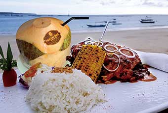 午餐後安排【香蕉船】,您可以享受水上活動的樂趣,也可結伴在沙灘上,踩著細軟的沙子打一場沙灘排球,若不玩水上活動者,您可輕鬆悠閒於休息區玩象棋,跳棋,西洋棋或麻將..等;亦可與夥伴穿著印尼傳統服裝悠閒的拍照。隨後您可以嘗試新穎的【獨木舟】到海上一遊。爾後安排精采可期的鬥雞表演。