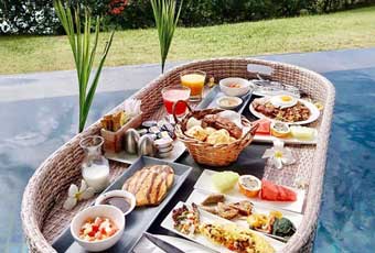 【網紅浪漫漂浮早餐】現在網紅都流行在泳池內吃早餐你知道嗎?特別安排在泳池別墅享用漂浮早餐,木製的大型托盤將食物在水中托起,恣意享受靜謐的早餐時光,記得穿上美美比基尼拍出驚艷無比的照片打卡上傳~網紅非你莫屬!