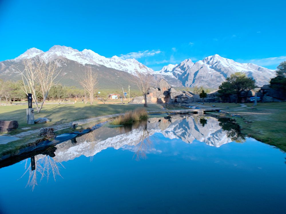 藍月谷位於玉龍雪山山腳下,積雪融水後,又經岩層過濾,形成白水河往下匯聚成湛藍的玉液湖。