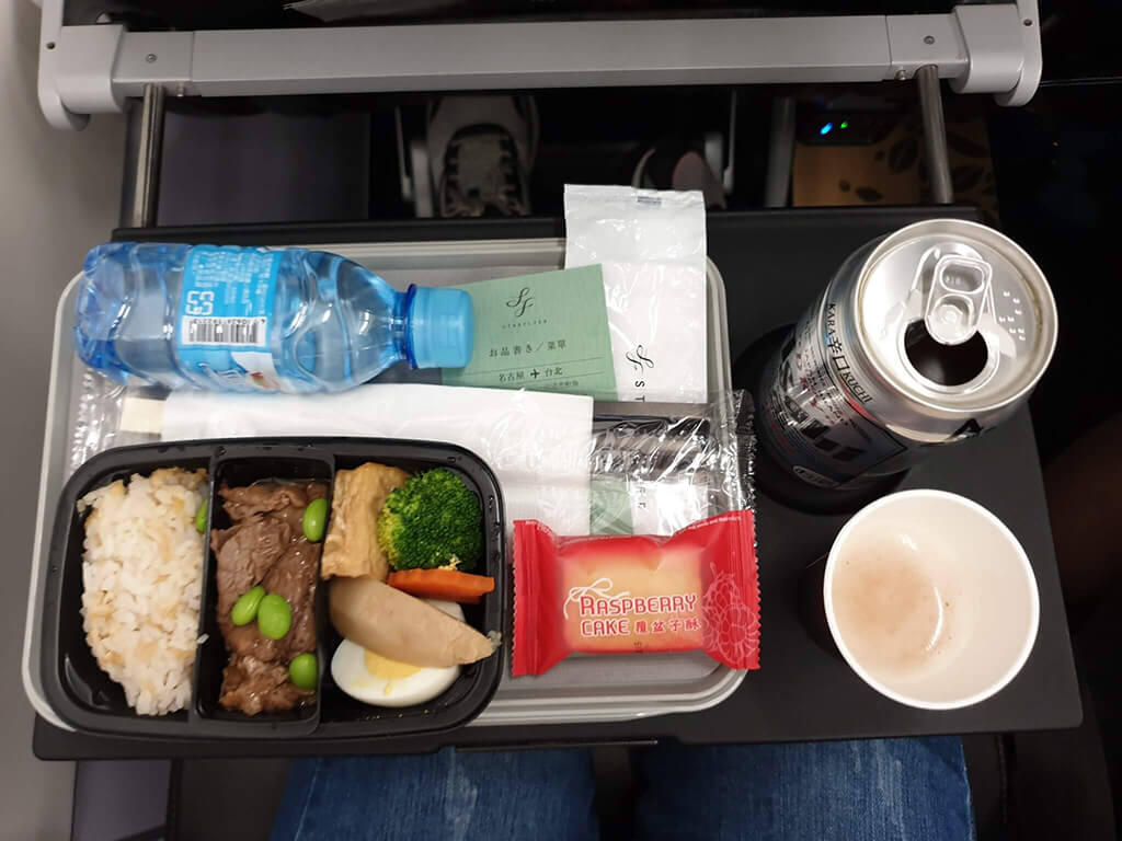 再來要介紹的就是機上餐食,機上提供的飯盒很精緻,麻雀雖小但五臟俱全,無論是味道、香味、餐食的熱度都比傳統航空公司來的好(個人見解),機上提供免費的飲料,除了最常見的咖啡、茶、蘋果汁之外還有日本的啤酒ASAHI、麒麟免費喝,對於男生食量來說可能會稍嫌不足,但下飛機後立刻就有更多的日本美食等著你!