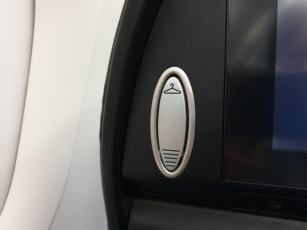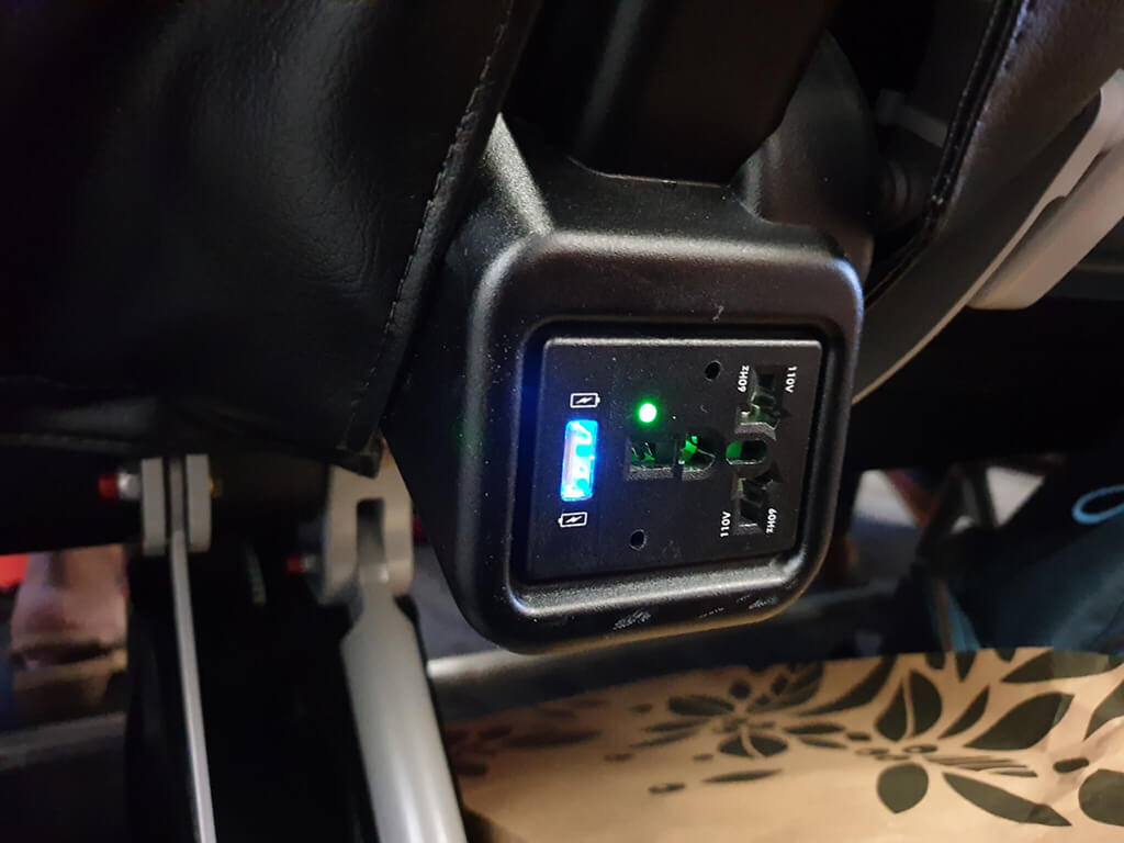 隨身的行李包包可以放在腳踏板下方,空間也是相當的大完全不用擔心,另外座位下方還有USB充電插座,即使是商務客常常使用手機電腦也很OK,不用怕沒電,還有貼心的衣服掛勾可以掛衣服。