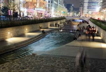 位於清溪川起點的世宗路清溪川廣場為清溪川復原工程起點,自東亞日報前一直到新踏鐵橋間,總長160m、寬50m,總面積達2,106坪,由噴水池、瀑布、清溪川模型、步道與探訪路組成。741坪的清溪川廣場位於清溪川復原起點的中心,以韓國傳統包巾造型設計而成,呈現各種顏色的石材包裝,表達出優雅的傳統之美。這裡設有清溪川的縮小模型,可一次瀏覽復原後的清溪川全貌,並設有22座橫跨清溪川的小橋解說板,還有各種造型的噴水池,打造出夢幻般的景觀。